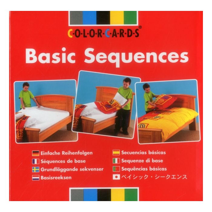 Basic Sequences fra ColorCards-serien indeholder 48 farverige fotokort fordelt på 16 forskellige 3-trinssekvenser. Hver sekvens illustrerer almindelige dagligdags aktiviteter, som fx at rede seng, pakke en gave ind eller tage tøj på.