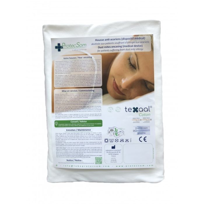 Betrækket er åndbart, komfortabelt og lukkes med en lynlås dækket af en bred flap, der forhindrer allergenlækage.